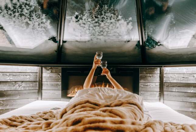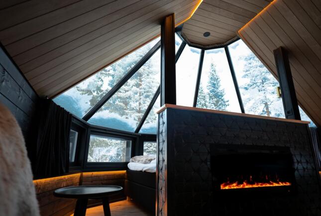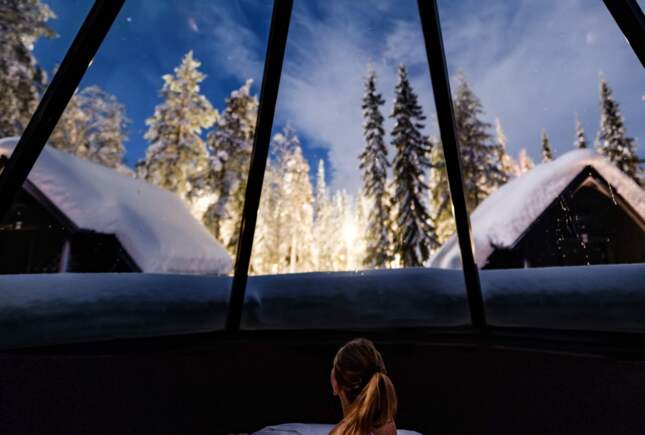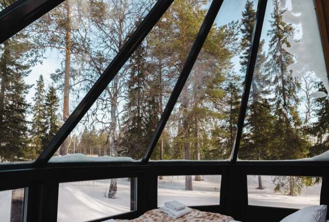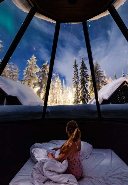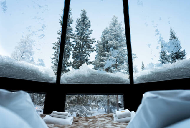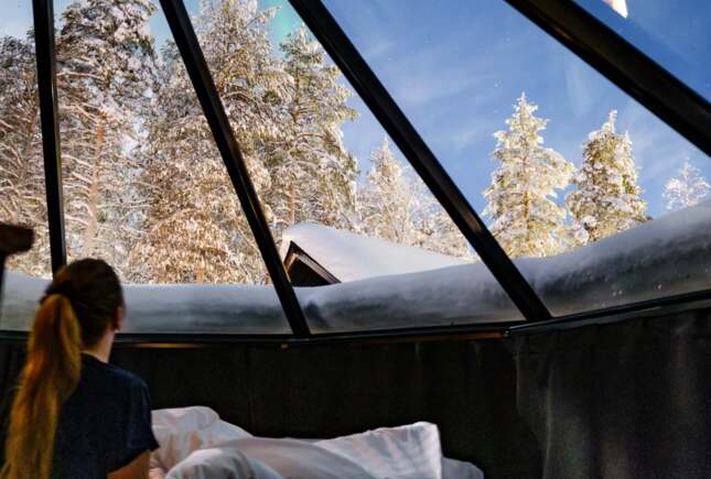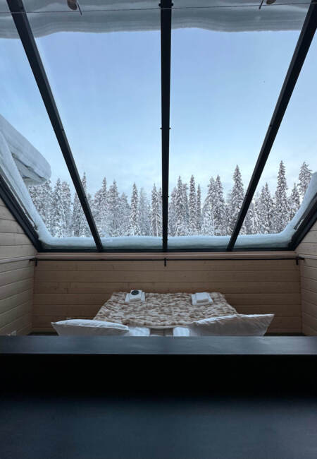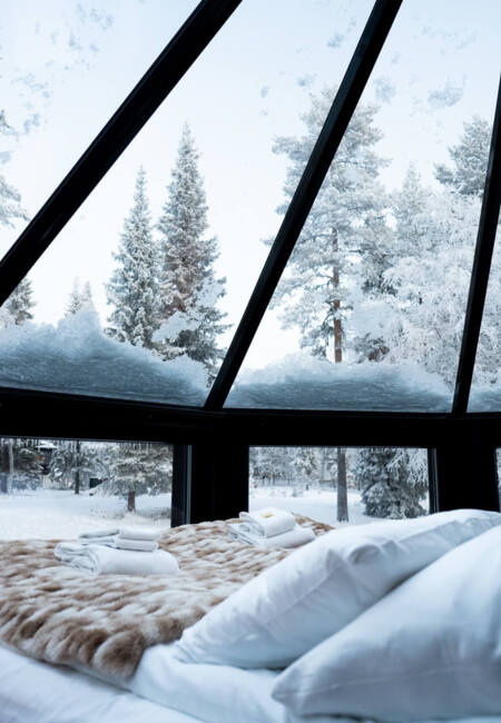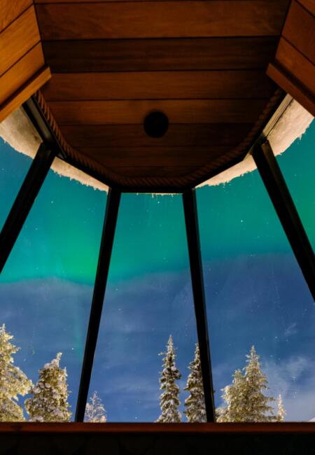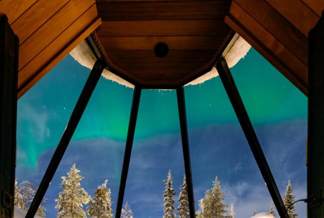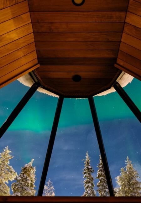 At midnight, a white arctic fox dashes up the fells, trailing its tail through the snow shooting flickers into the sky. The Aurora Borealis burst into flame over Lapland. Only the glass roof separates you and your warm bed from the cold, flaming sky.