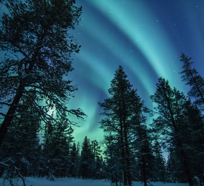 The quiet snowy forest, the nocturnal fell, and the magical Northern Lights above.