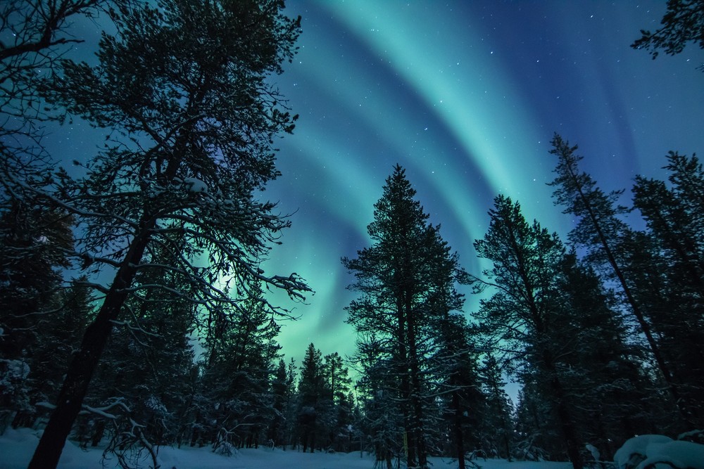 The quiet snowy forest, the nocturnal fell, and the magical Northern Lights above.